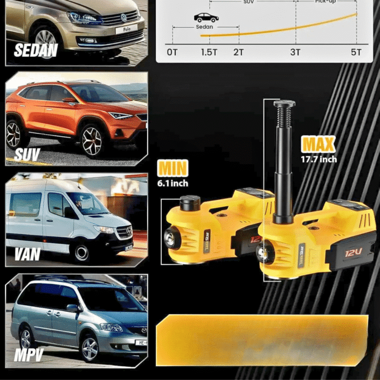 Dimentica gli sforzi fisici e i cric manuali: questo dispositivo elettrico ti permette di sollevare in totale sicurezza qualsiasi auto, SUV o furgone fino a 5 tonnellate, semplicemente premendo un pulsante. Nessuna fatica, nessuna incertezza: il sollevamento è rapido, stabile e controllato in ogni fase.