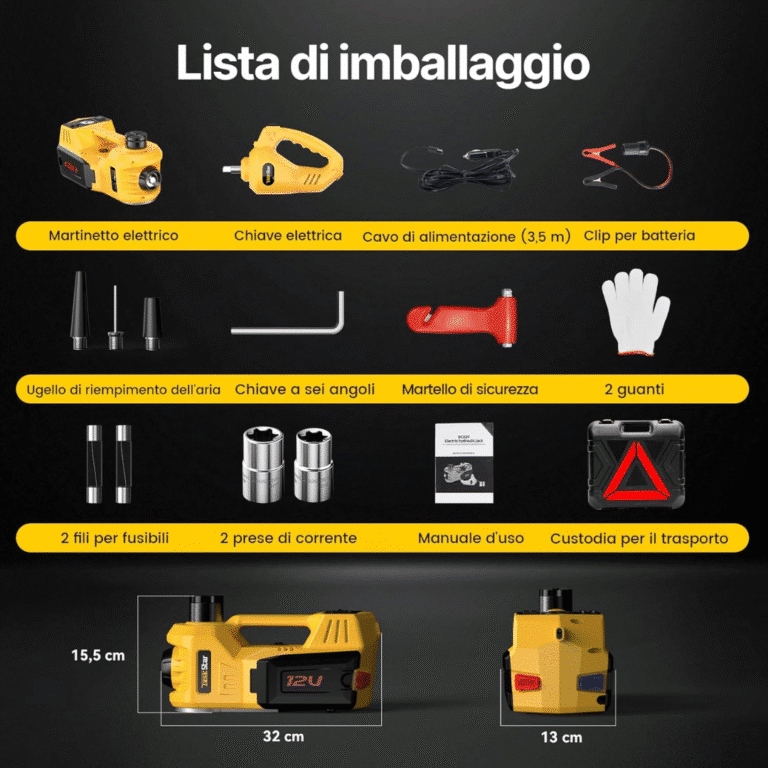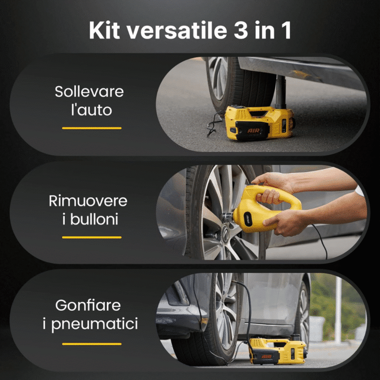 Ero in autostrada, gomma a terra, buio e pioggia. Con questo kit ho sollevato il SUV, svitato i bulloni e gonfiato la ruota di scorta in meno di 15 minuti. La luce LED è stata fondamentale. Non sono un esperto ma l’ho usato senza problemi. Lo consiglio a chi viaggia spesso.