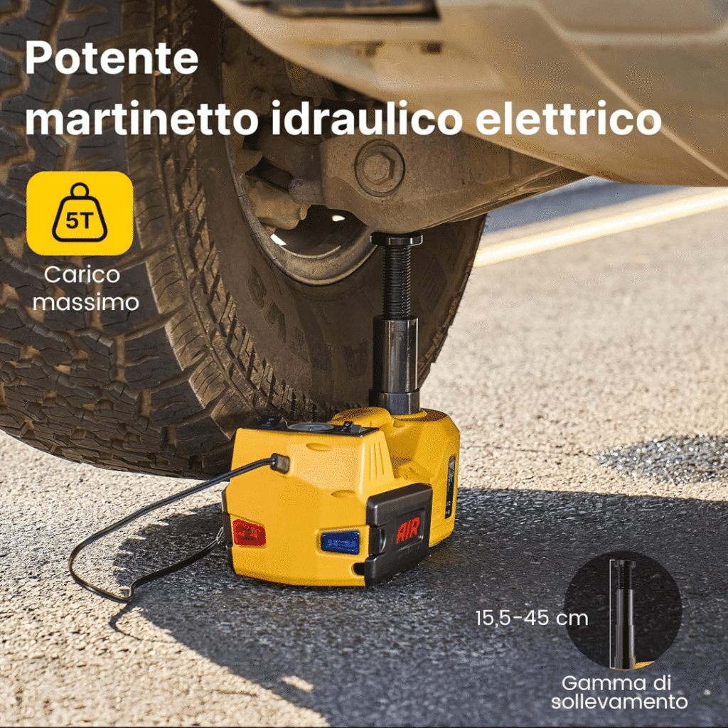 Lo tengo sempre nel bagagliaio. Cric, compressore e chiave elettrica in una sola valigetta: geniale. Ho una station wagon pesante e lo solleva senza sforzo. L’unico dettaglio migliorabile? Il cavo un po’ corto, ma nulla di grave. Lo ricomprerei subito.