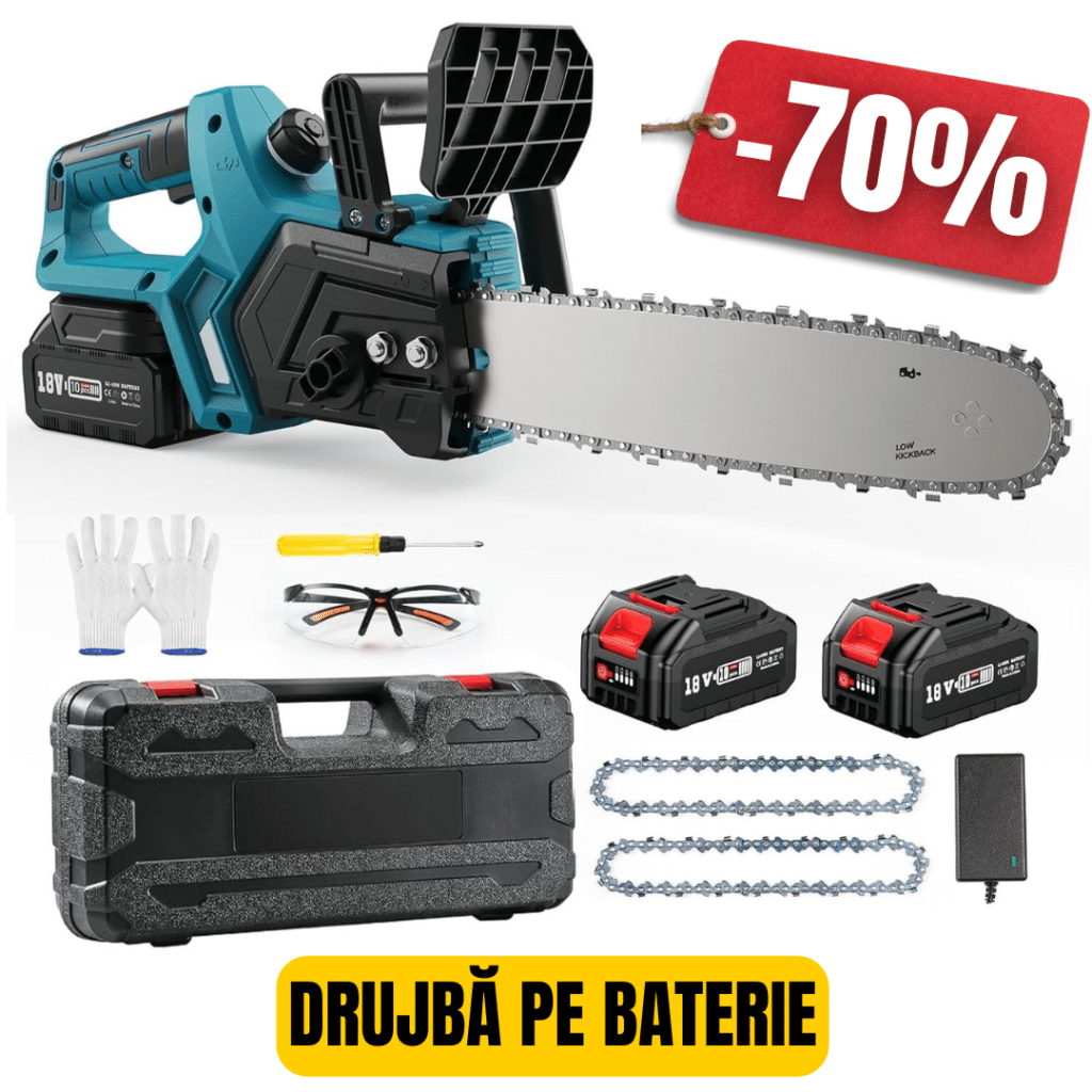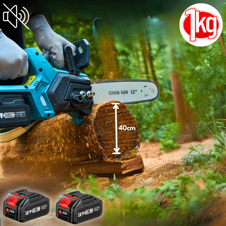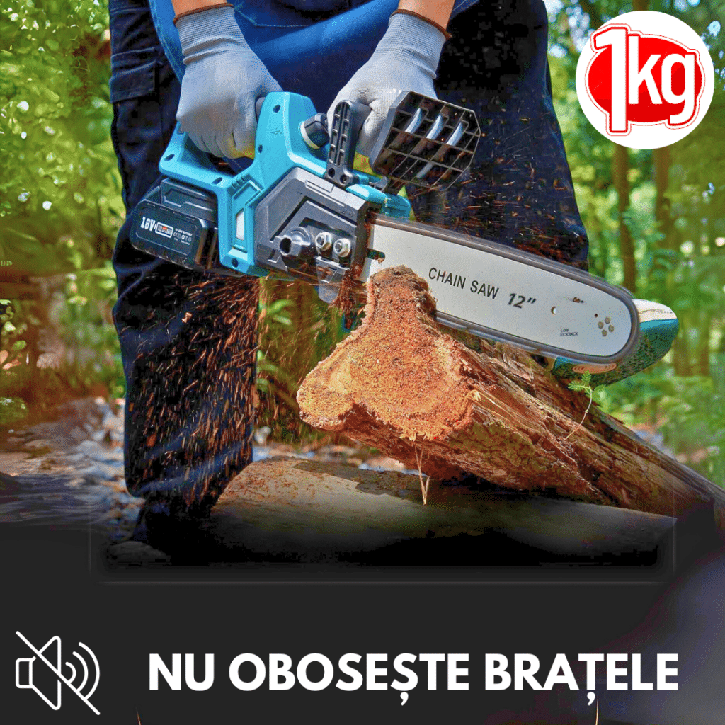 Echipată cu un lanț auto-lubrifiant, taie orice tip de lemn ca prin unt. 100% Silențioasă și Ușoară, cântărește doar 1kg și nu obosește brațele. Are 2 baterii de 10.000mAh care oferă 12 ore de autonomie completă și o fac mult mai Puternică decât cele pe benzină. Nu necesită întreținere.